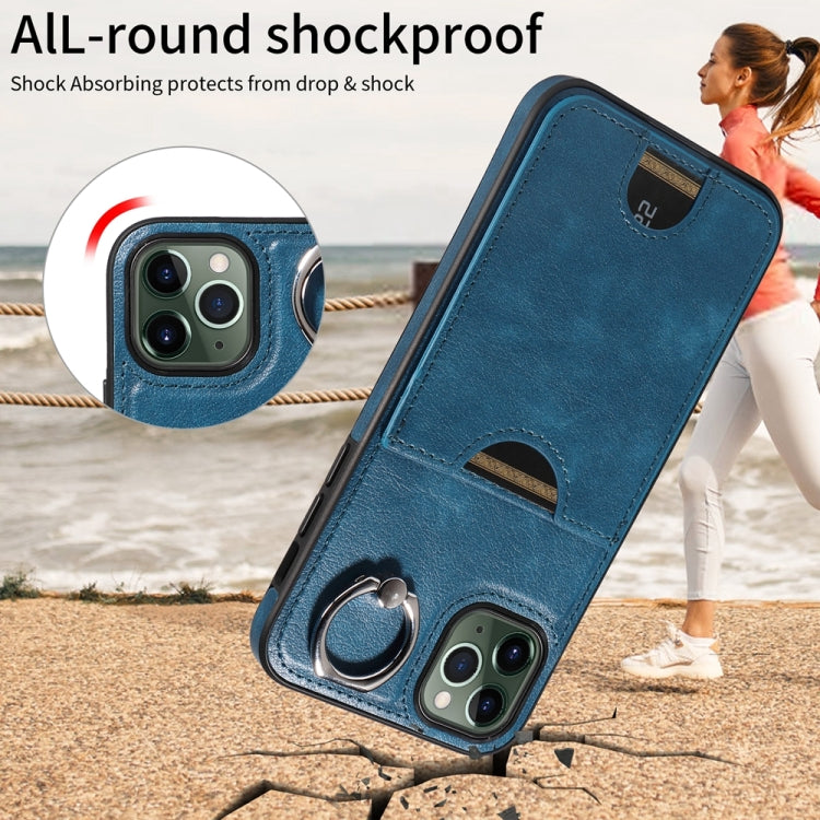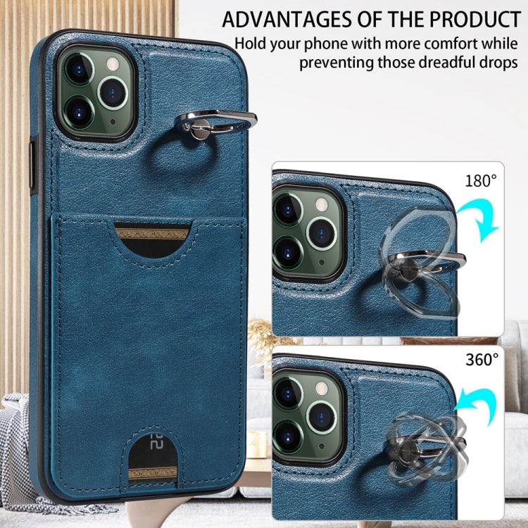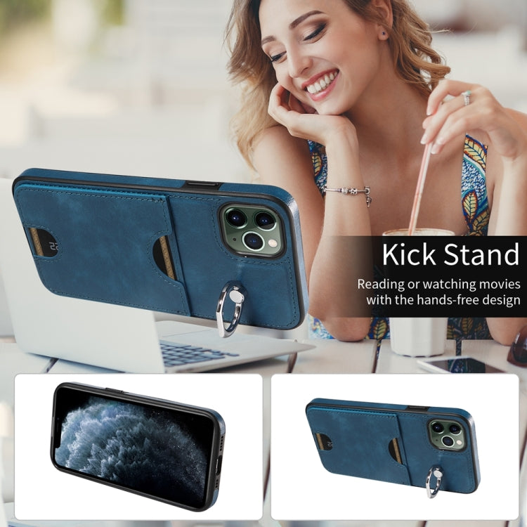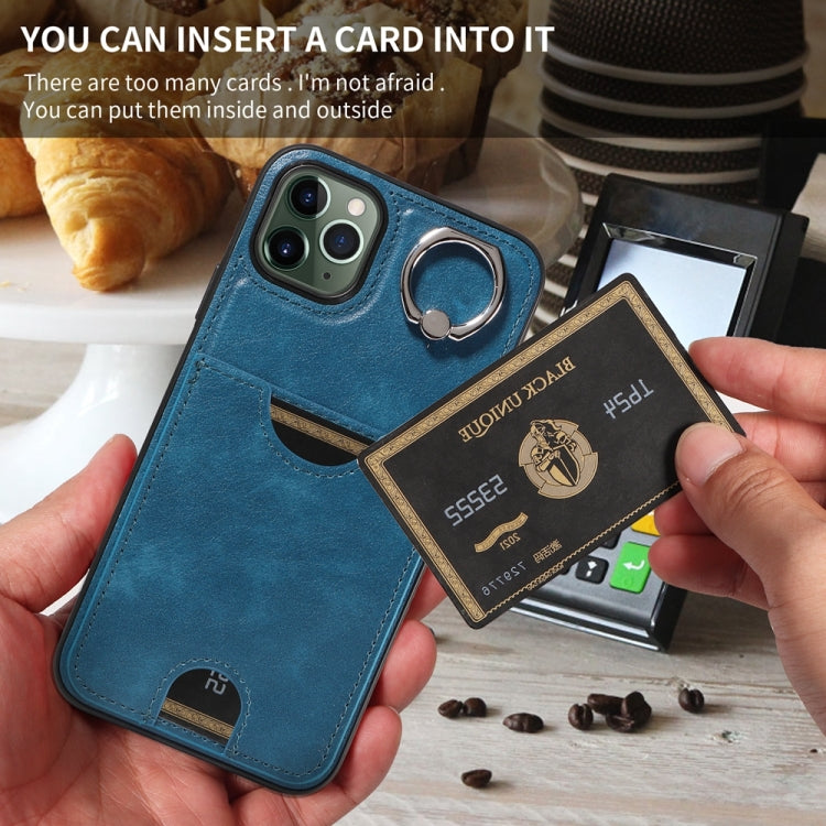 For iPhone 11 Pro Max Calf Texture Card Slot Ring Holder Phone Case(Blue)