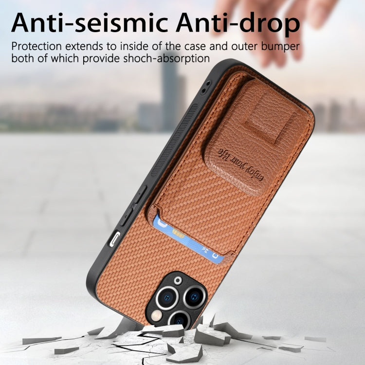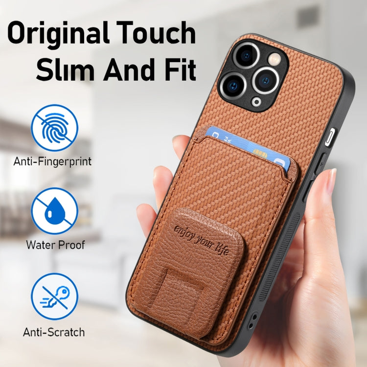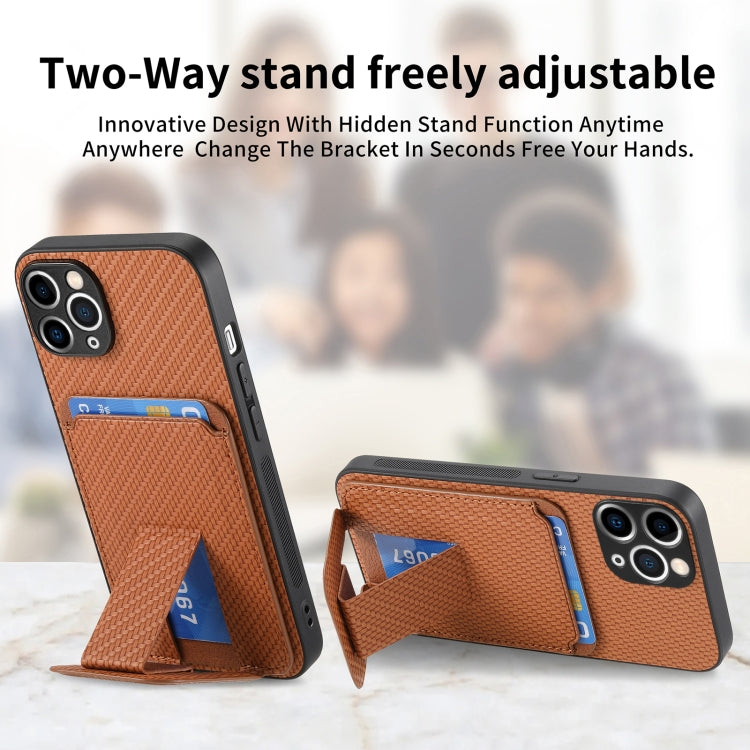 For iPhone 11 Pro Max Carbon Fiber Card Bag Fold Stand Phone Case(Brown)