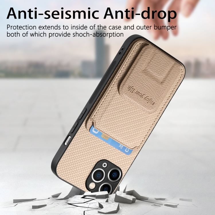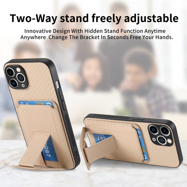 For iPhone 11 Pro Max Carbon Fiber Card Bag Fold Stand Phone Case(Khaki)