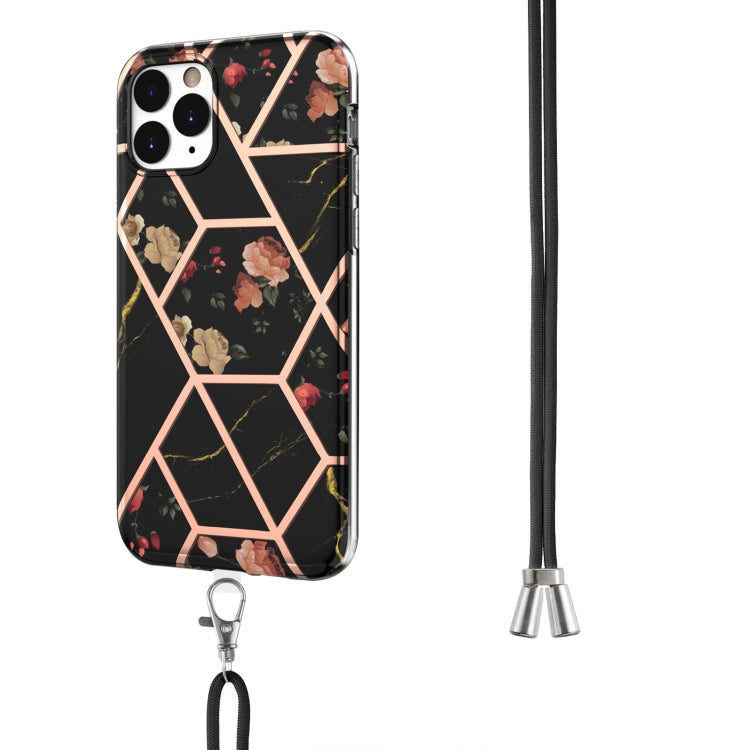 For iPhone 11 Pro Max Electroplating Splicing Marble Flower Pattern TPU Shockproof Case with Lanyard (Black Flower)