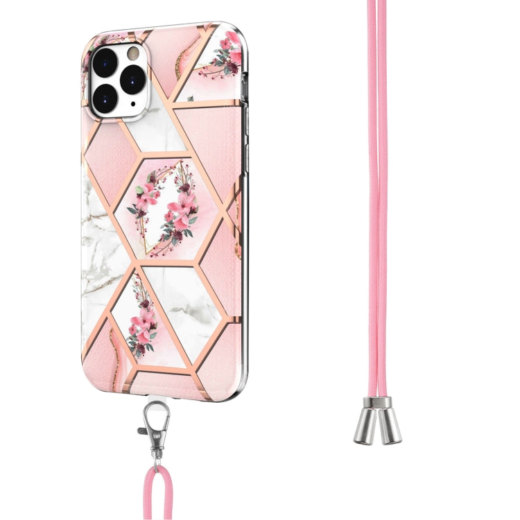 For iPhone 11 Pro Max Electroplating Splicing Marble Flower Pattern TPU Shockproof Case with Lanyard (Pink Flower)