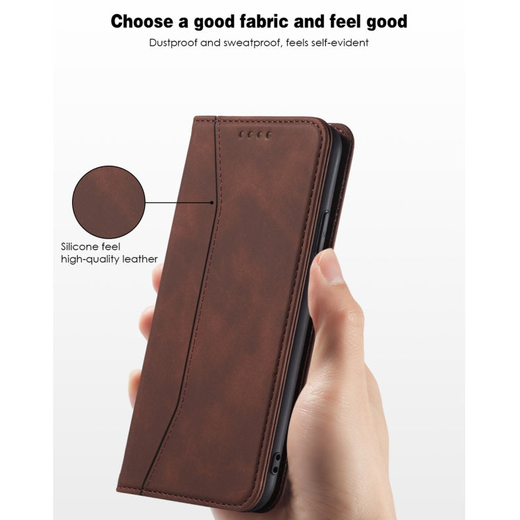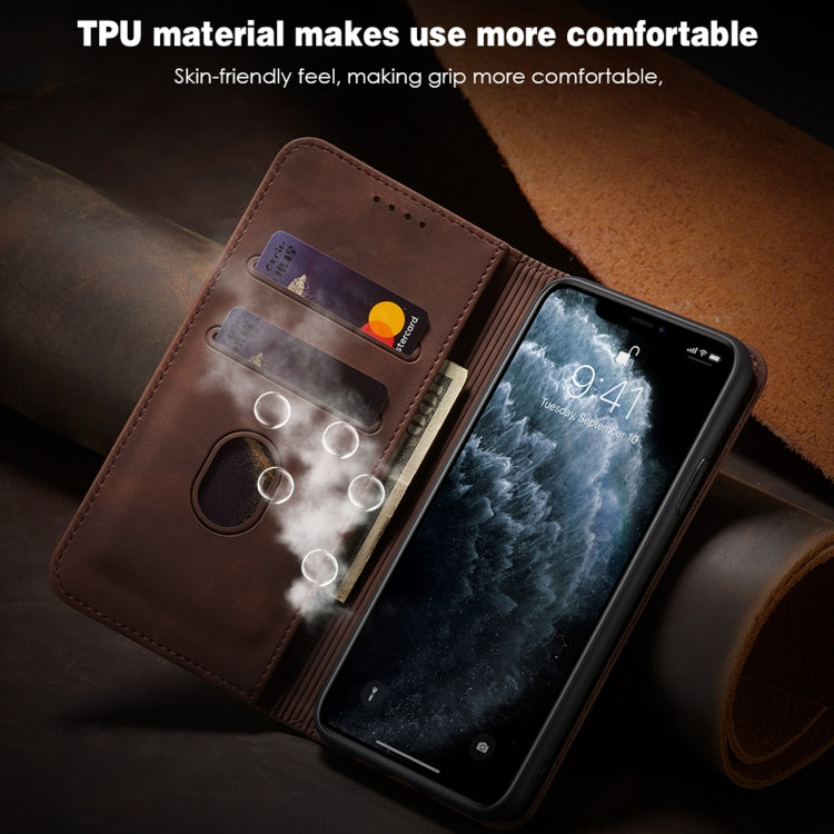 For iPhone 11 Skin-feel Calfskin Texture Magnetic Dual-Fold Horizontal Flip Leather Case with Holder & Card Slots & Wallet (Coffee)
