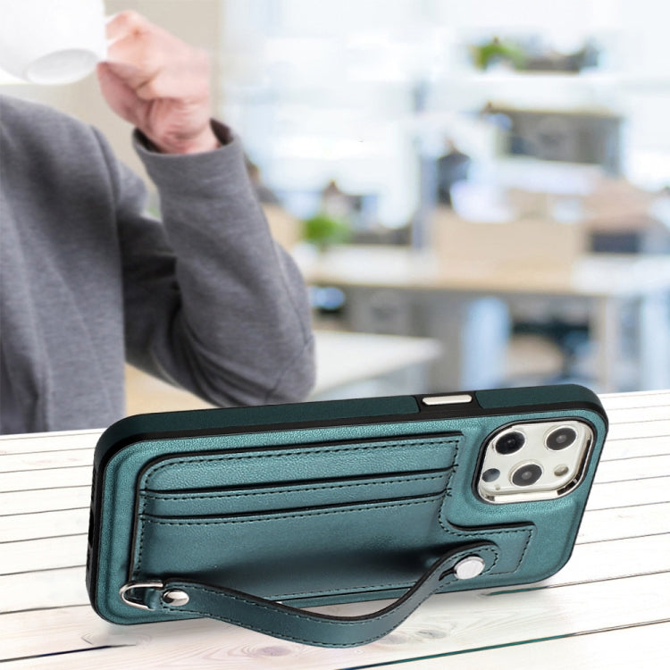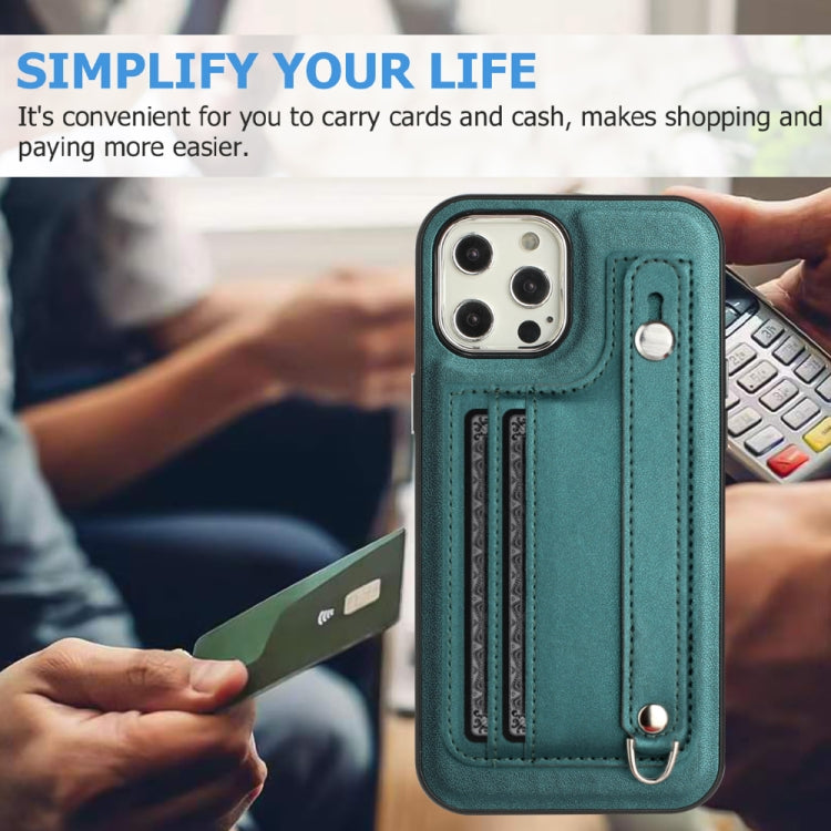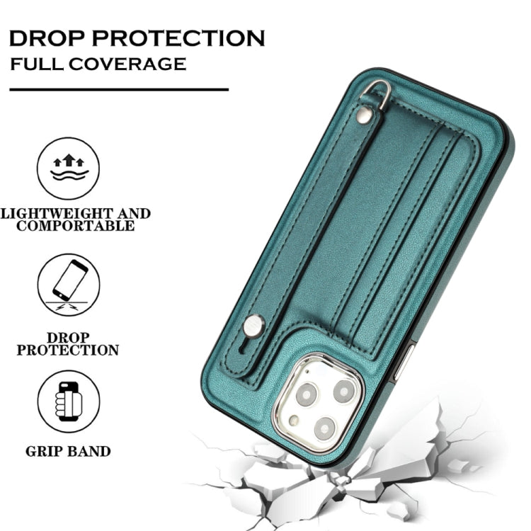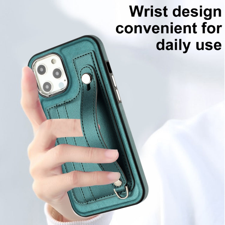 For iPhone 12 Pro Max Shockproof Leather Phone Case with Wrist Strap(Green)
