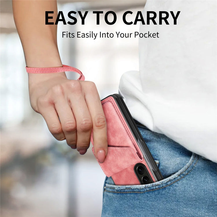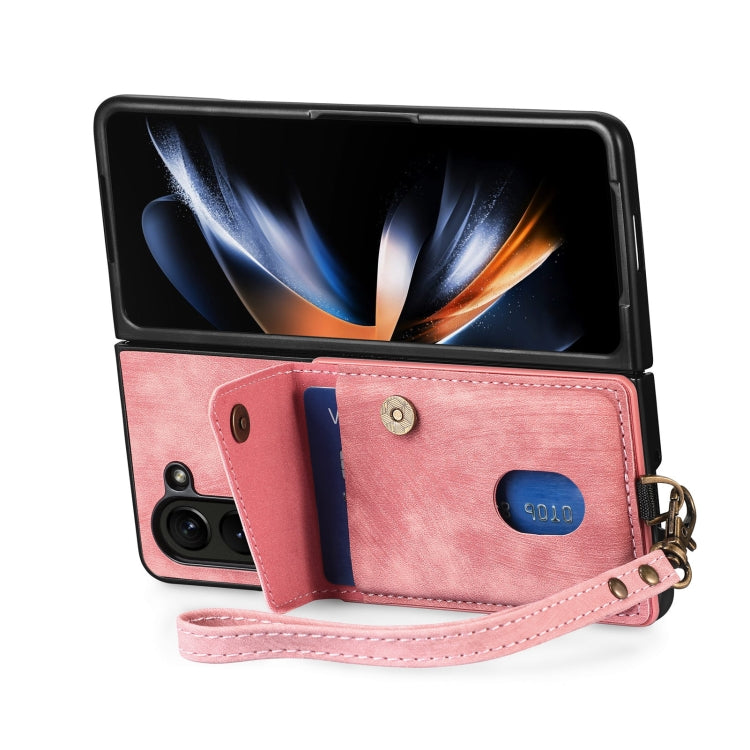 For Samsung Galaxy Z Fold5 5G Retro Card Wallet Fold Leather Phone Case with Strap(Pink)
