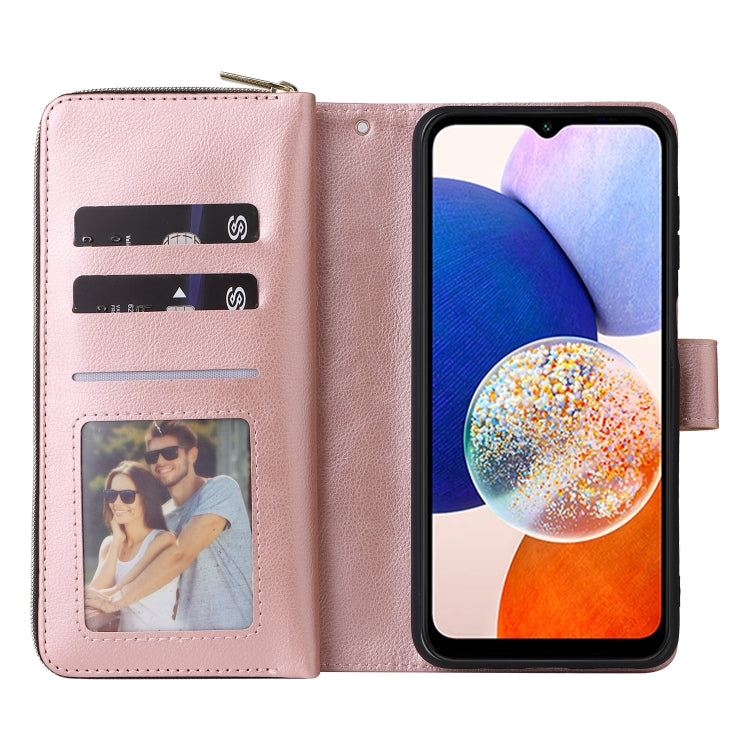 For Samsung Galaxy A15 5G 9-Card Slots Zipper Wallet Bag Leather Phone Case(Rose Gold)