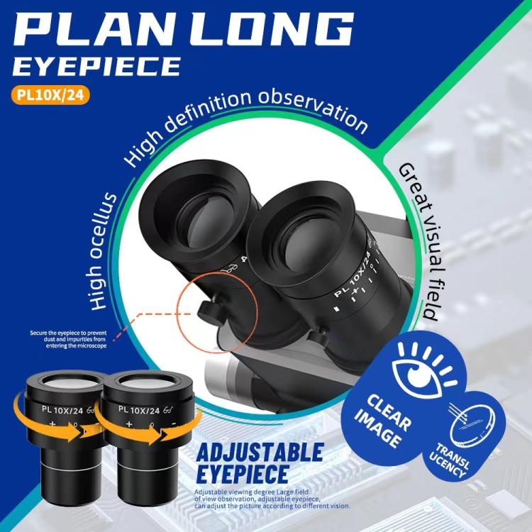 2. This time, the flat-field eyepiece PL10X/24 is used, and the PL eyepiece has a long exit pupil distance, allowing the operator wearing glasses to observe comfortably and display a complete field of vision