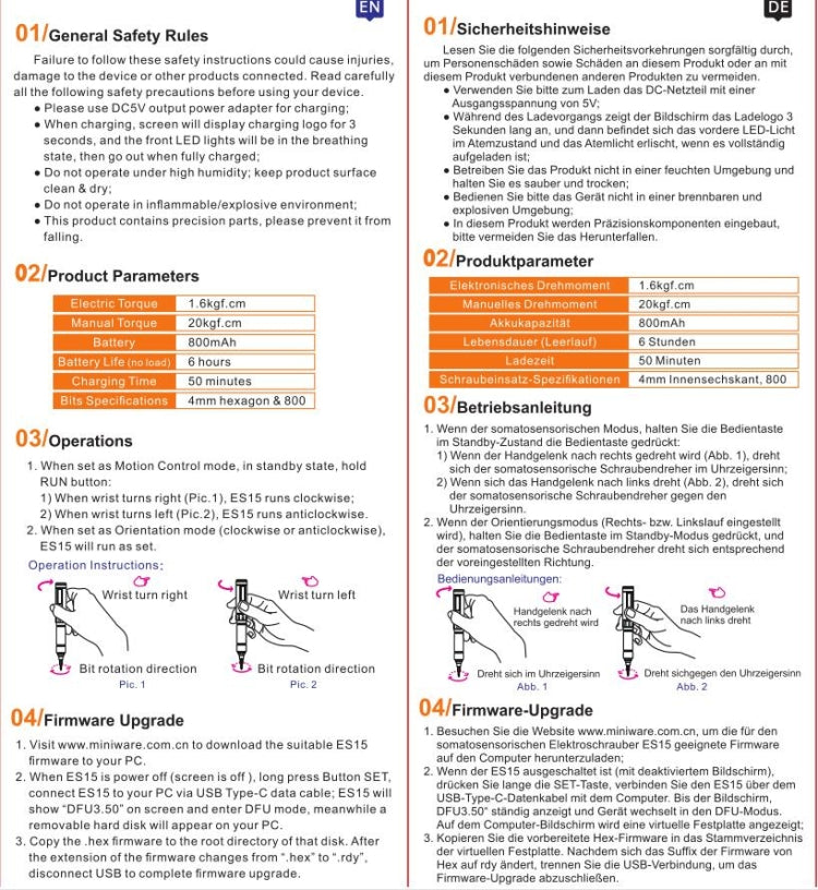 1. Intelligent somatosensory recognition and orientation mode: ES15 can be set to different working modes of intelligent somatosensory recognition and directional mode (forward rotation, reverse rotation); somatosensory recognition is suitable for quick maintenance, and directional mode is used for heavy disassembly tasks