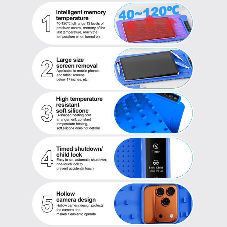 4. Large Screen Disassembly, LCD Separation: 17-inch large size design(380x250mm), can meet the different temperature requirements of screen disassembly of different devices such as mobile phones, tablets, watches, etc.